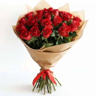 Наши красные розы отобраны с любовью и заботой, чтобы гарантировать их свежесть и безупречный вид. Они аккуратно собраны в стильной крафтовой упаковке, которая придаёт букету естественный и современный вид. Завершает композицию роскошная атласная лента, добавляющая нотку утонченности и элегантности.