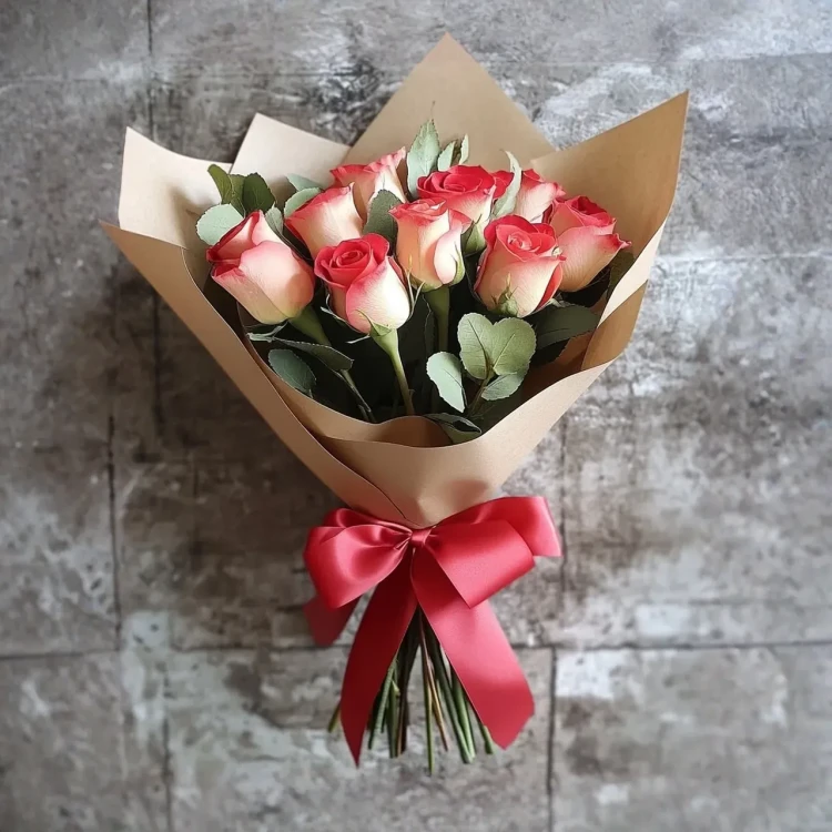 Этот очаровательный букет из девяти алых роз — истинное воплощение страсти и романтики. Каждая роза, с яркими и насыщенными лепестками, словно горящие огоньки, передает тепло и нежность чувств. Их изысканная форма и насыщенный цвет создают впечатление безмятежной красоты и утонченности. Букет аккуратно оформлен в стильной крафтовой упаковке, которая добавляет нотку естественности и простоты, подчеркивая великолепие самих цветов.